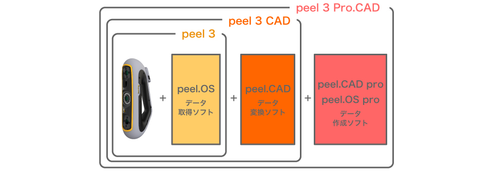 ラインアップには本体と専用ソフトウェア“peel.OS”からなる基本セットの「peel 3」と、基本セットに加えてCADへの移行を行うためのプラグインモジュール“peel.CAD”が付属した「peel 3.CAD」、さらに高度なリバースモデリングを行うための「Peel 3 Pro.CAD」の3種類をご用意しております。お客様のCAD導入状況や活用場面に応じてパッケージを選択していただくことが可能です。