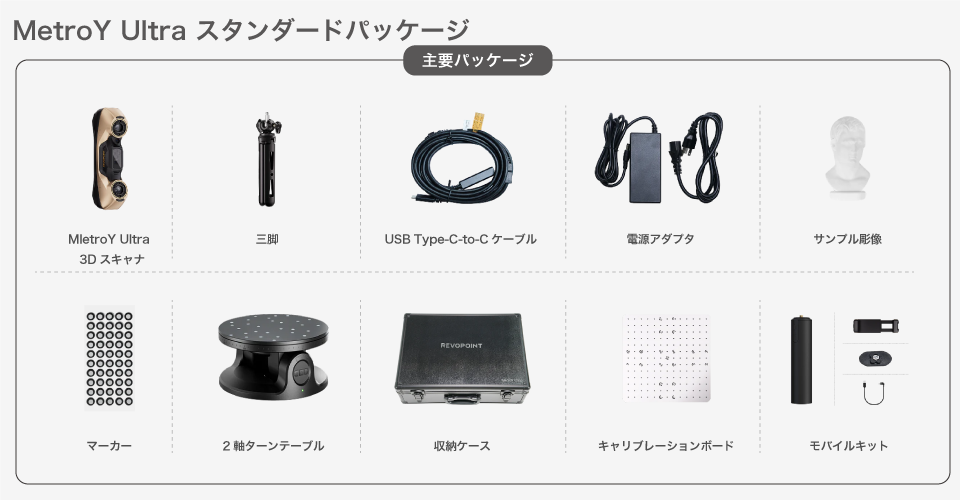 MINI 2ではハンディタイプメインの「スタンダードパッケージ」・据え置きタイプをメインの「ターンテーブルコンボ/アドバンスパッケージ」、POP3 Plusでは「スタンダードパッケージ」・据え置きタイプメインの「アドバンスパッケージ」、手振れによるトラッキングロスを解消する「プレミアムパッケージ」があります。MIRACOでは16GBメモリ の「MIRACO」、MetroX/Proでは「スタンダードパッケージ」・マーカーブロックキットが付属した「アドバンスパッケージ」を用意しております。また、MetroY/Proでは「スタンダードパッケージ」と携帯でも使用できる「モバイルキットパッケージ」、MetroY Ultraでは「スタンダードパッケージ」と寸法測定に特化した「CMMパッケージ」を用意しており、用途に合わせてお選びいただけます。