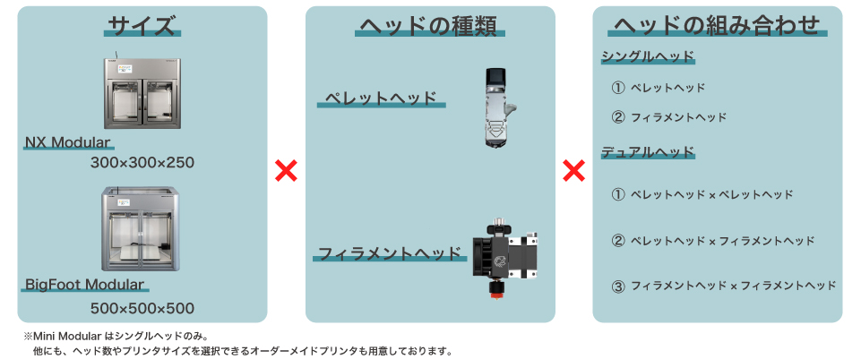 ペレット材料が使えるデュアルヘッドの選択はもちろん、1台でFDMとペレットの材料の両方を使用できる組合せのプリンタもあり、用途に合わせて選択していただけます。