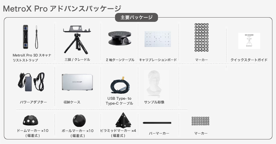MINI 2ではハンディタイプメインの「スタンダードパッケージ」・据え置きタイプをメインの「ターンテーブルコンボ/アドバンスパッケージ」、POP3 Plusでは「スタンダードパッケージ」・据え置きタイプメインの「アドバンスパッケージ」、手振れによるトラッキングロスを解消する「プレミアムパッケージ」があります。MIRACOでは16GBメモリ の「MIRACO」、MetroX/Proでは「スタンダードパッケージ」・マーカーブロックキットが付属した「アドバンスパッケージ」を用意しております。また、MetroY/Proでは「スタンダードパッケージ」と携帯でも使用できる「モバイルキットパッケージ」を用意しており、用途に合わせてお選びいただけます。
